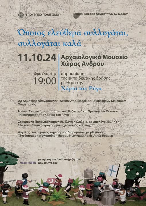 Χάρτα του Ρήγα ή Χάρτα της Ελλάδας. Αποτελεί κεντρικό έκθεμα της περιοδικής έκθεσης «Το Αρχιπέλαγος φλέγεται» της Εφορείας Αρχαιοτήτων Κυκλάδων στο Αρχαιολογικό Μουσείο Μυκόνου για τον εορτασμό των 200 χρόνων από την έναρξη της Ελληνικής Επανάστασης του 1821. Εντάσσεται στην τρίτη ενότητα με τίτλο Το ανεξάντλητον λατομείον του παρελθόντος, στην οποία παρουσιάζεται η επίδραση της ελληνικής αρχαιότητας στη δημιουργία της εθνικής συνείδησης για την έναρξη της Ελληνικής Επανάστασης.